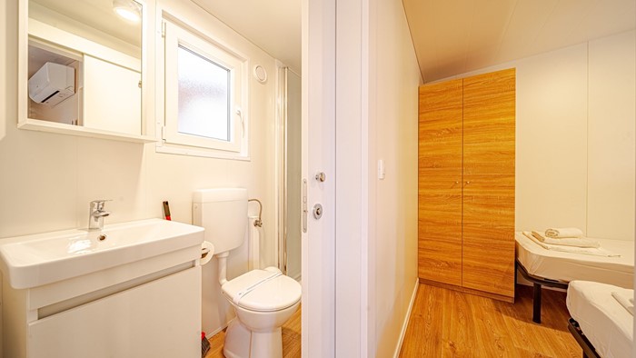 Equipment in mobile homes: • Air conditioning • SAT TV • Dining room with the table and two chairs • Sofa bed • Kitchenette • Gas cooker with hood • Refrigerator • Kitchen accessories 2 Bathrooms: • Shower with glass doors • Washbasin • Toilet • Towels 2 Bedrooms: • 1st bedroom with double bed • 2nd bedroom with twin beds • Linen