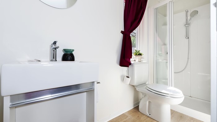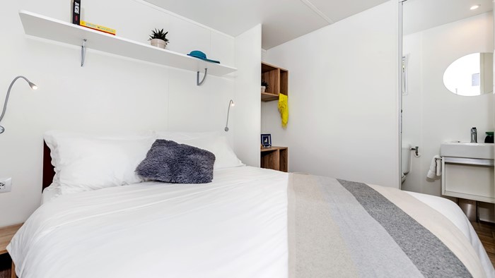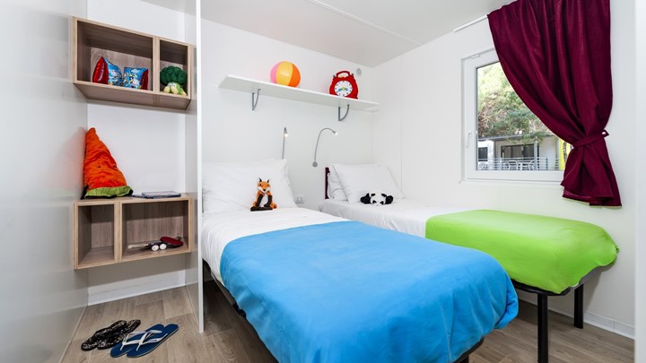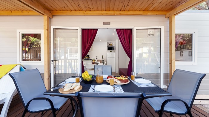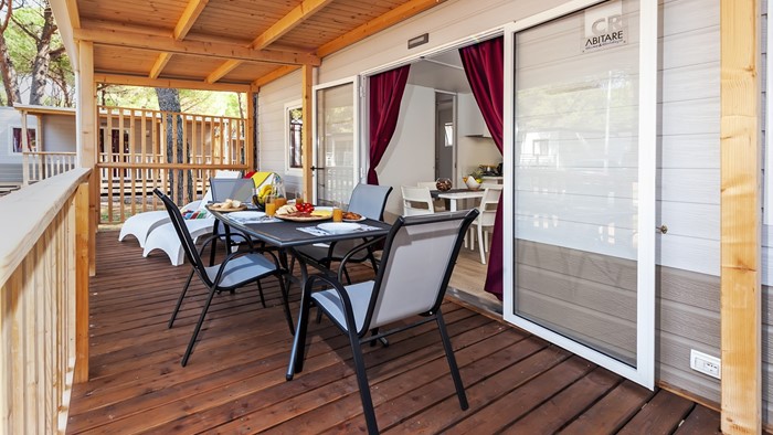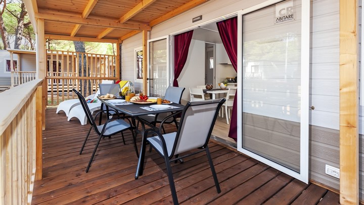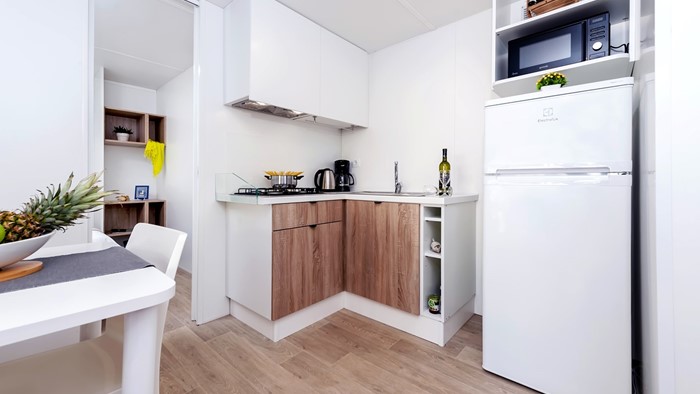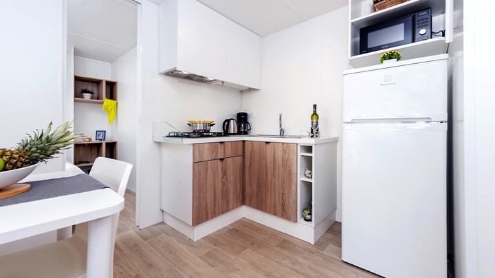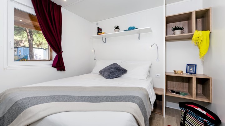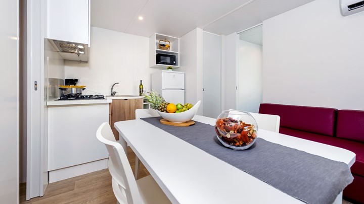 • ukupna površina: 32 m² • dimenzije mobilne kućice: 8 x 4 m • broj ležaja: 4 osnovna + 2 pomoćna • 2 spavaće sobe • kuhinja / blagovaonica • 2 kupaonice • drvena natkrivena terasa veličine: 6 x 2,5 m • parkirno mjesto • klima uređaj • SAT TV
