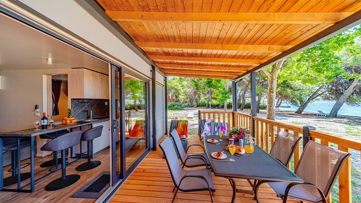 • Površina: 40m² • Dimenzije: 8,7 x 4,6 m • Broj ležaja: 4 osnovna + 2 pomoćna • 2 spavaće sobe • kuhinja / blagovaonica • 2 kupaonice • Drvena natkrivena terasa • Pozicija: 1. red uz plažu