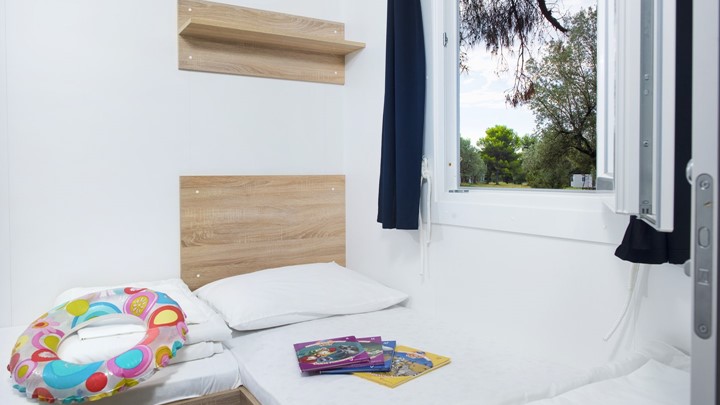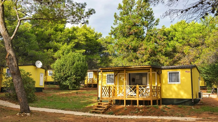 • ukupna površina: 24 m² • dimenzije mobilne kućice: 8 x 3 m • broj ležaja: 4 osnovna + 1 pomoćni • 2 spavaće sobe • kuhinja / blagovaonica • 1 kupaonica • drvena natkrivena terasa veličine: 4 x 2,5 m • besplatan parking (zajednička parkirna površina za sve goste mobilnih kućica Adriatic Kampova) • klimatizacijski uređaj • SAT TV