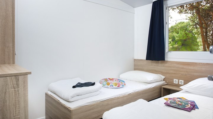 • Klima uređaj • SAT TV • Blagovaonica sa stolom i 2 stolice • Kauč na razvlačenje s 2 spavaća mjesta • Kuhinjska niša • Plinski štednjak s napom • Hladnjak • Kuhinjski pribor • Ostakljena tuš kabina • Umivaonik • WC • Ručnici • 1. spavaća soba s bračnim krevetom • 2. spavaća soba s odvojenim ležajevima • Posteljina
