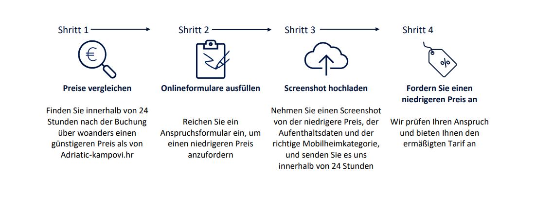 Wenn Sie ein Mobilheim auf einem unserer Campingplätze buchen möchten, gehen Sie einfach direkt auf unsere Website. Hier garantieren wir die besten Angebote und Preise. Buchen Sie online unter Adriatic-kampovi.hr oder rufen Sie direkt an, damir bieten wir einen Preis mit unserer Niedrigstpreisgarantie an. Wenn Sie in einer anderen qualifizierten Online-Quelle, die wir verifizieren können, einen niedrigeren Online-Preis für die gleichen Daten und Buchungbedingungen finden, passen wir ihn gerne an und geben Ihnen einen zusätzlichen Rabatt von 5 % auf Ihren Aufenthalt. Bitte sehen Sie unten, wie es funktioniert.