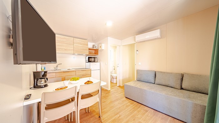 Equipment in mobile homes: • Air conditioning • SAT TV • Dining room with the table and two chairs • Sofa bed • Kitchenette • Gas cooker with hood • Refrigerator • Kitchen accessories 2 Bathrooms: • Shower with glass doors • Washbasin • Toilet • Towels 2 Bedrooms: • 1st bedroom with double bed • 2nd bedroom with twin beds • Linen