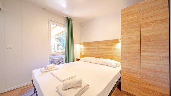 • total area: 32 m² • dimensions of mobile home: 8 x 4 m • number of beds: 4 + 1 additional • 2 bedrooms • kitchen / dining room • 2 bathrooms • wooden terrace: 18 m² • parking place • air conditioning • SAT TV