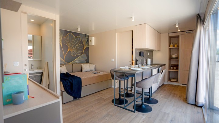 • Površina: 40m² • Dimenzije: 8,7 x 4,6 m • Broj ležaja: 4 osnovna + 2 pomoćna • 2 spavaće sobe • kuhinja / blagovaonica • 2 kupaonice • Drvena natkrivena terasa • Pozicija: 1. red uz plažu