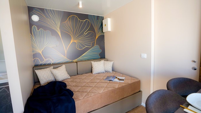 • Klima uređaj • SAT TV • Ležaljke za sunčanje • Blagovaona sa stolom i 4 stolca • Kauč s 2 spavaća mjesta • Kuhinjska niša • Plinski štednjak • Mikrovalna pećnica • Perilica posuđa • Hladnjak • Aparat za kavu • Kuhinjski pribor • Staklena tuš kabina • Umivaonik • Wc • Ručnici • 1. spavaća soba s bračnim krevetom • 2. spavaća soba s odvojenim ležajevima • Posteljina