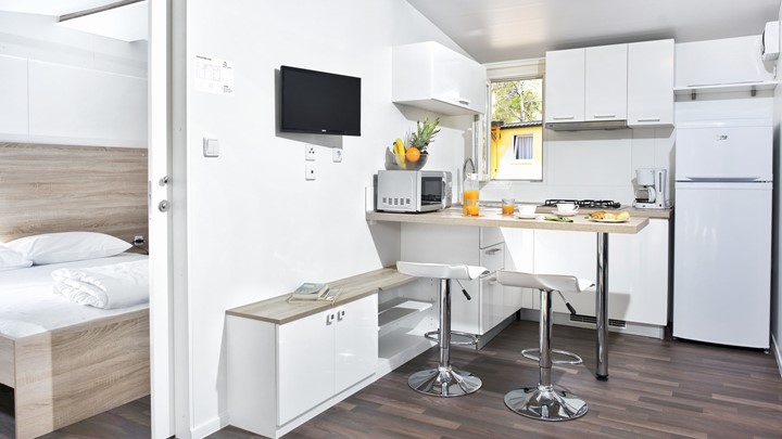 Wyposażenie domków mobilnych: • Klimatyzacja • SAT TV • CD /DVD • Leżaki do opalania • Jadalnia ze stołem i 2 krzesłami • Kanapa rozkładana 2-osobowa • Wnęka kuchenna • Kuchenka gazowa • Kuchenka mikrofalowa • Lodówka • Ekspres do kawy • Przybory kuchenne 2 łazienki: • Szklana kabina prysznicowa • Umywalka • Toaleta • Ręczniki 2 sypialnie: • Pierwsza sypialnia z łóżkiem podwójnym • Druga sypialnia z oddzielonymi łóżkami • Pościel