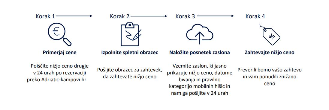 Če želite rezervirati mobilno hišico v enem od naših kampov pojdite naravnost na našo spletno stran. Zagotavljamo vam, da tukaj boste našli najboljše ponudbe in cene. Rezervirajte preko spleta na Adriatic-kampovi.hr ali neposredno pokličite prodajni oddelek in bomo stali za našo ceno z našim jamstvom najnižje cene. Če na spletu najdete nižjo ceno za iste datume in pogoje pri katerem koli drugem kvalificiranem spletnem viru, ki ga lahko preverimo, z veseljem vam bomo uskladili ceno in vam bomo odobrili dodaten 5-odstotni popust na vaše bivanje. Spodaj si oglejte kako se kvalificirati.