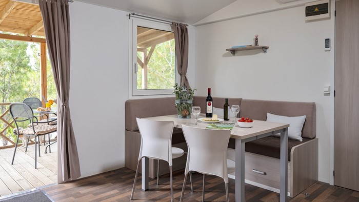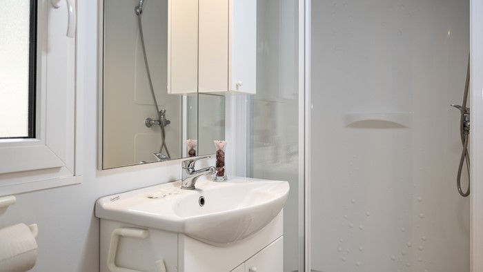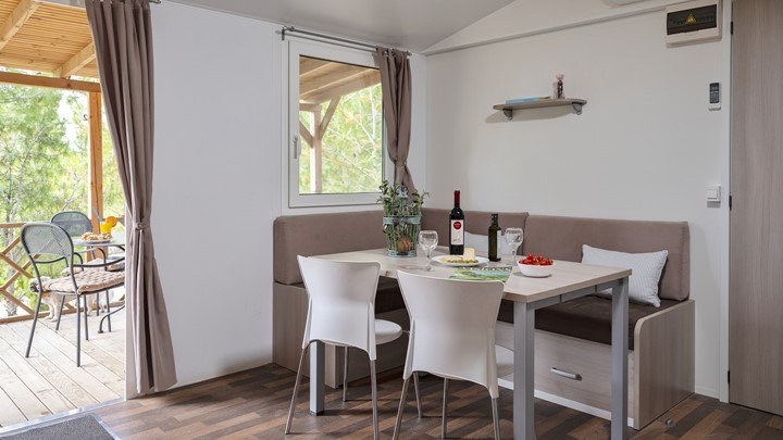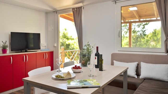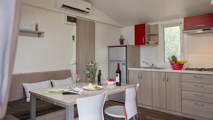 Opremljenost mobilnih hišica: • Klima • SAT TV • Jedilnica z mizo in 2 stoloma • Kavč na izvlačenje z 2 spalnimi mesti • Kuhinjska niša • Plinski štedilnik z napo • Hladilnih • Kuhinjski pribor 2 Kopalnici: • Steklena tuš kabina • Umivalnik • WC • Sušilec za lase • Brisače 2 spalnici • 1. spalnica z zakonsko posteljo • 2. spalnica z ločenimi ležišči • Posteljnina