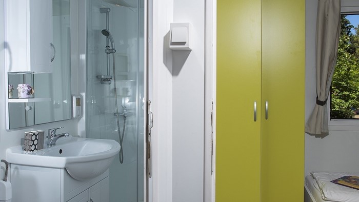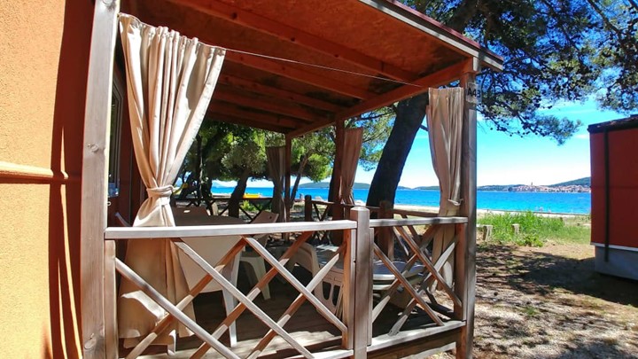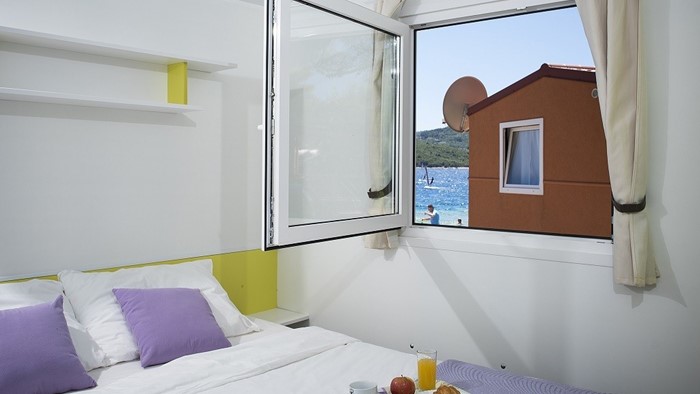 Opremljenost mobilnih hišic: • Klima • SAT TV • CD/DVD • Ležalniki za sončenje • Jedilnica z mizo in 2 stoloma • Kavč na izvlačenje z 2 spalnimi mesti • Kuhinjska niša • Plinski štedilnik z napo • Mikrovalovna pečica • Hladilnih • Aparat za kavo • Kuhinjski pribor 2 kopalnici: • Steklena tuš kabina • Umivalnik • WC • Sušilec za lase • Brisače 2 spalnici • 1. spalnica z zakonsko posteljo • 2. spalnica z ločenimi ležišči • Posteljnina